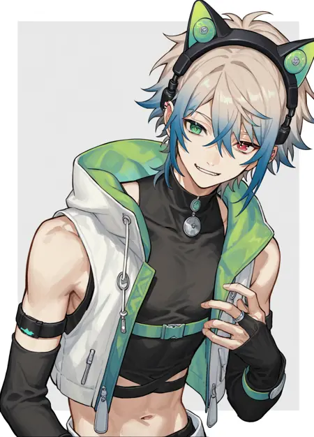 aza, 米色头发, 尼罗蓝头发, 多色头发, 渐变头发, 绿色眼睛, 红色眼睛, 异色瞳, 带帽兜夹克, 动物耳帽兜, 切割式上衣, 灰色裤子, 大腿绑带, 鞋子, 魔鬼尾巴, 腰带