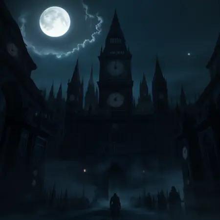 Addtional tags: bloodborne, scenery, sky, building, city, night sky, tower, star \\(sky\\), starry sky, city lights, moon