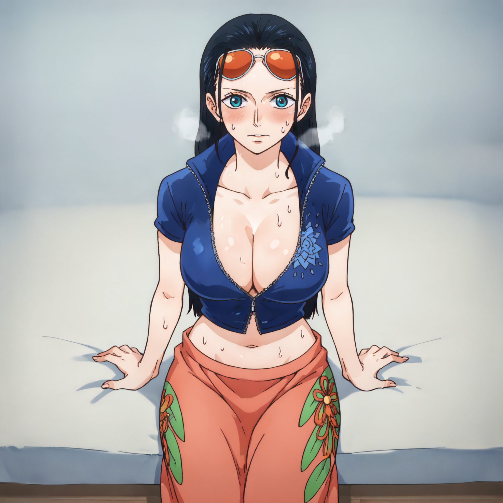 머리에 주황색 선글라스, 파란 재킷, 짧은 소매, 지퍼, 가슴 노출, 크롭탑, 배꼽, 생식기, 분홍 치마, 긴 치마, 매듭진 치마