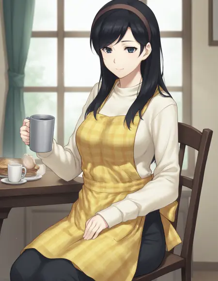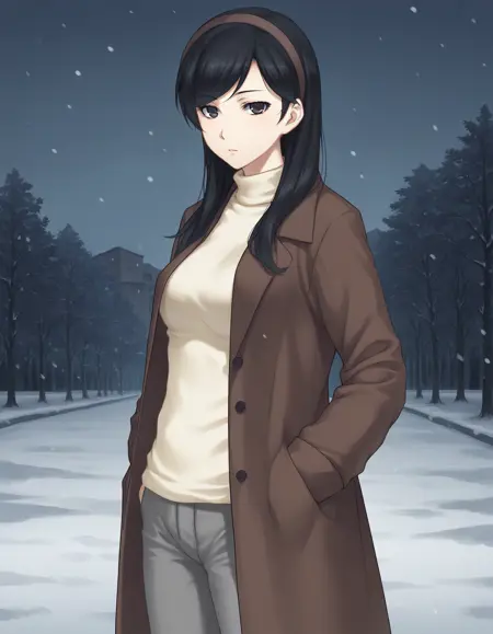 kayahara fuyumi, black hair, long hair, swept bangs, hair band, black eyes