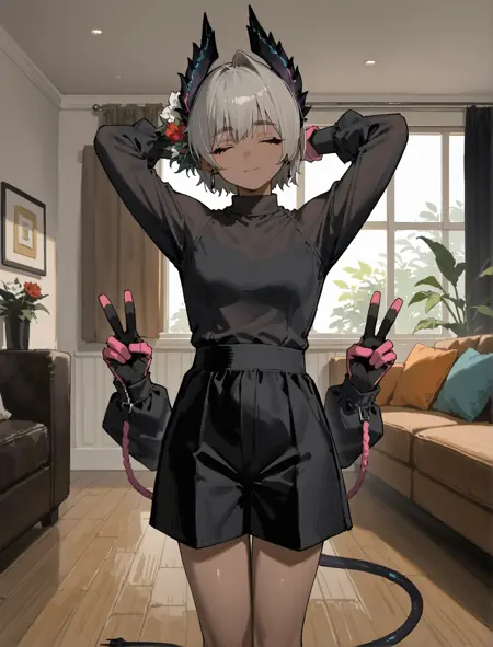 Raidian, dark skin, r_tail, liberi_horns, short hair, grey hair, bangs, closed eyes, hair flower,