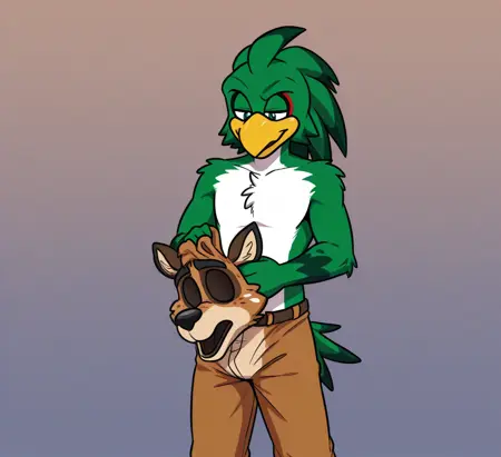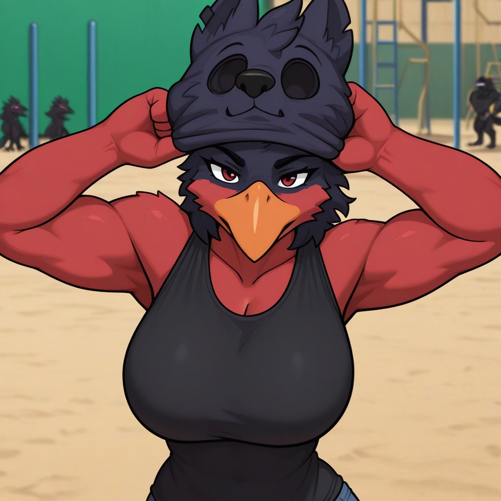 在角色穿着制服的同时手持匹配的面具/玩偶头像,生成这类图像可能具有挑战性,尤其是使用角色LoRA时,你可能需要降低角色的权重,或避免使用某些角色标签。