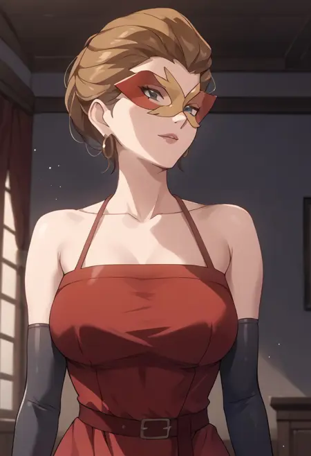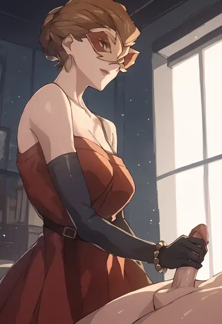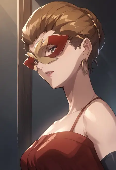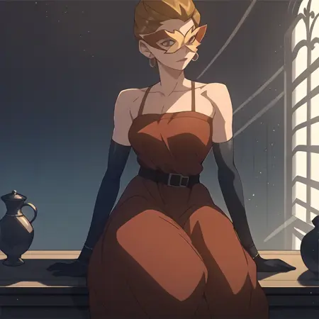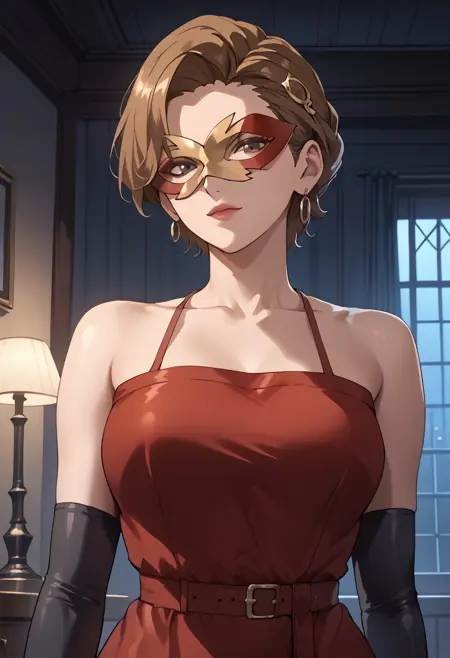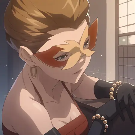 richlady, short hair, brown hair, mask,ear accessory, black gloves, bracelet, female,black eyes,