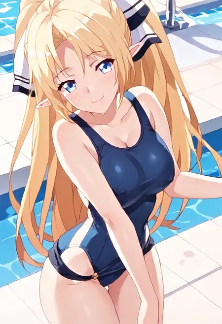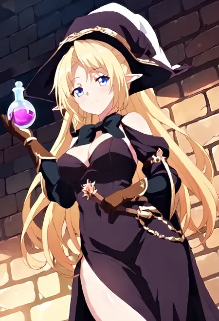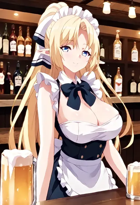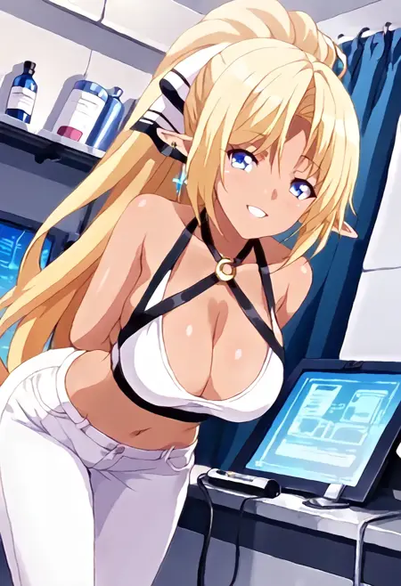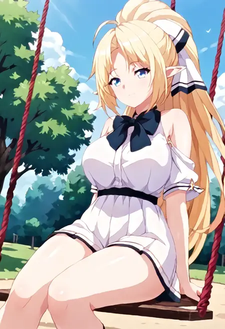 Iris Thea Eaderlindt, blonde hair, pointy ears, elf, long hair, blue eyes, ponytail,