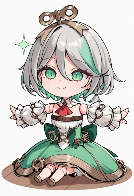 CeciliaDefault, green eyes, winding key hair ornament, doll joints, grey hair, colored inner hair, streaked hair, short hair, side braid, detached collar, red ascot, strapless dress, detached sleeves, chest belt, green corset, gears, green skirt, bloomers, white shorts under skirt, gold trim