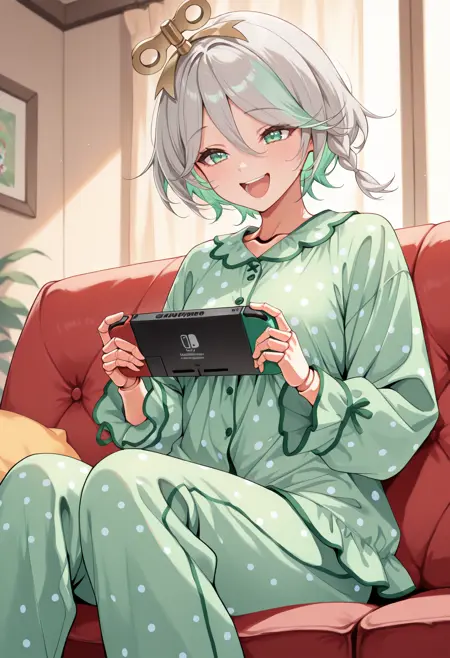 CeciliaImmergreen, green eyes, winding key hair ornament, doll joints, grey hair, colored inner hair, streaked hair, short hair, side braid