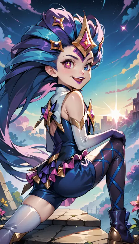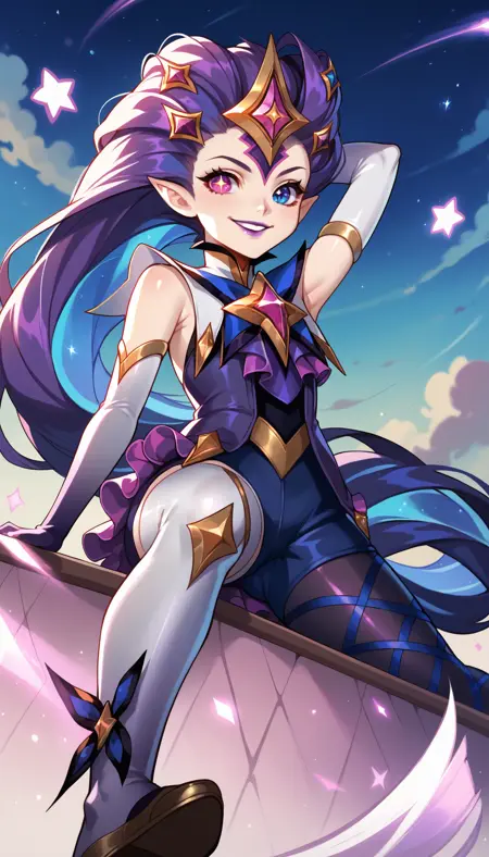 score_9, score_8_up, score_7_up, star guardian zoe, 1girl, star guardian (league of legends), bow, small breasts, heterochromia, blue eye, pink eye, star-shaped pupils, asymmetrical legwear, mismatched legwear, single leg pantyhose, single thighhigh, multicolored long hair, purple and blue hair, hair ornament, gem, bodysuit, frills, gradient elbow gloves, purple lips, flat shoes, looking at viewer, smile, pointy ears, armpits, star (symbol), arm up, glowing, floating, magic, space,