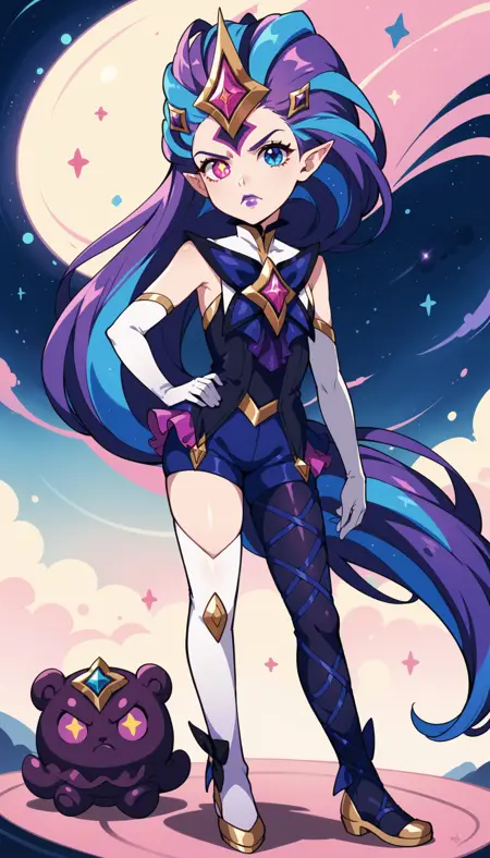 score_9, score_8_up, score_7_up, 星守者佐伊, 1girl, 星守者(英雄联盟), 弓, 小乳房, 异色瞳, 蓝色眼睛, 粉色眼睛, 星形瞳孔, 不对称腿部服饰, 不匹配的腿部服饰, 单腿丝袜, 单侧大腿袜, 多彩长发, 紫色与蓝色头发, 头饰, 宝石, 连体衣, 荷叶边, 渐变肘部手套, 紫色嘴唇, 平底鞋, 望向观众, 微笑, 尖耳朵, 腋下, 星星(符号), 手臂上举, 发光, 漂浮, 魔法, 太空,