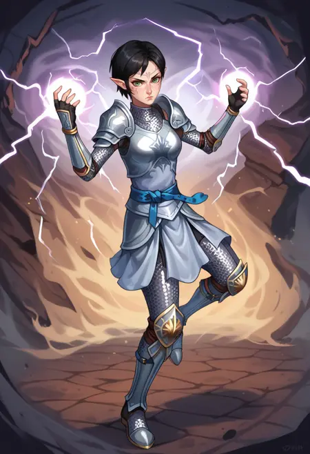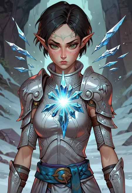 대체 옷차림(로맨스 아머) - M3rralt-ill, 초록 눈, 날카로운 귀, 얼굴 문신, 얼굴 무늬, 짧은 머리, 검은 머리, 은색 갑옷, 은색 어깨 패드, 팔찌, 손가락 없는 장갑, 짧은 갑옷 스커트, 부츠, 파란 벨트,