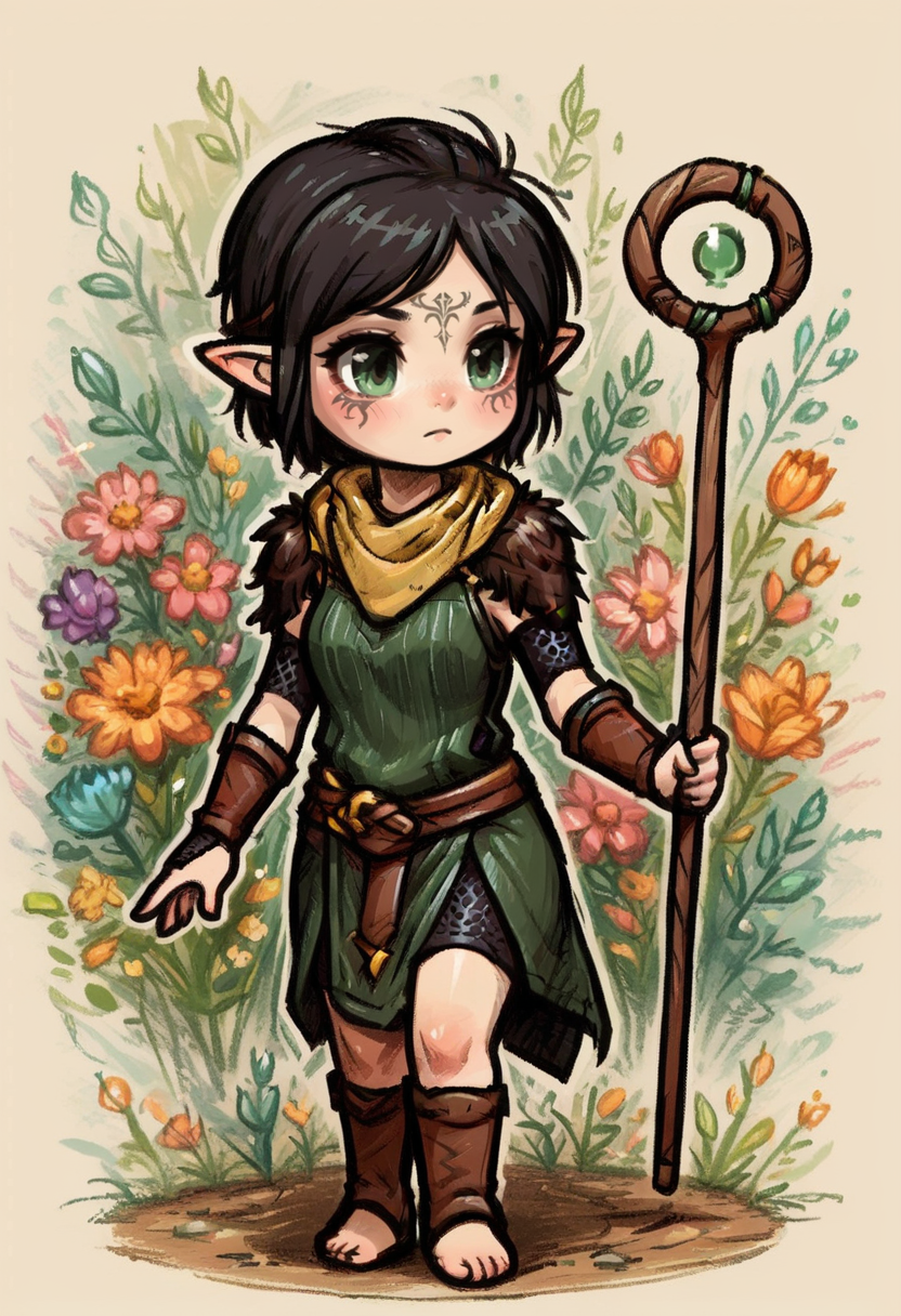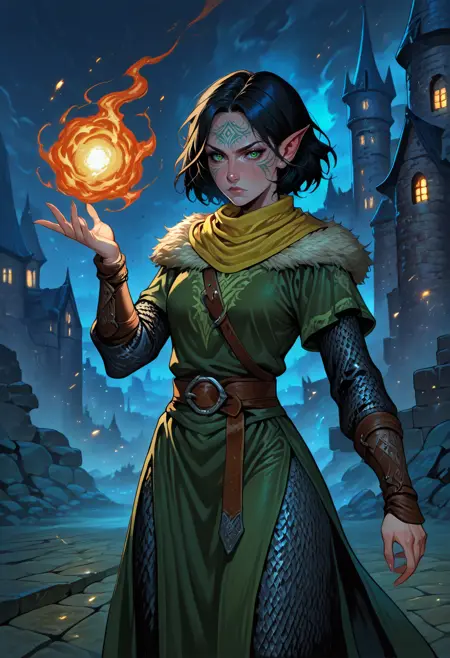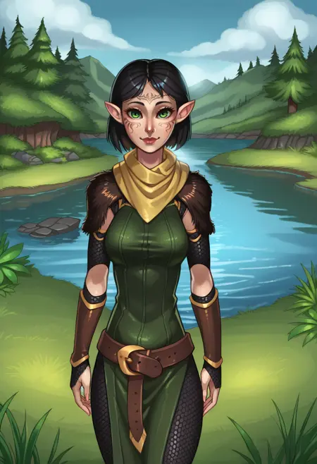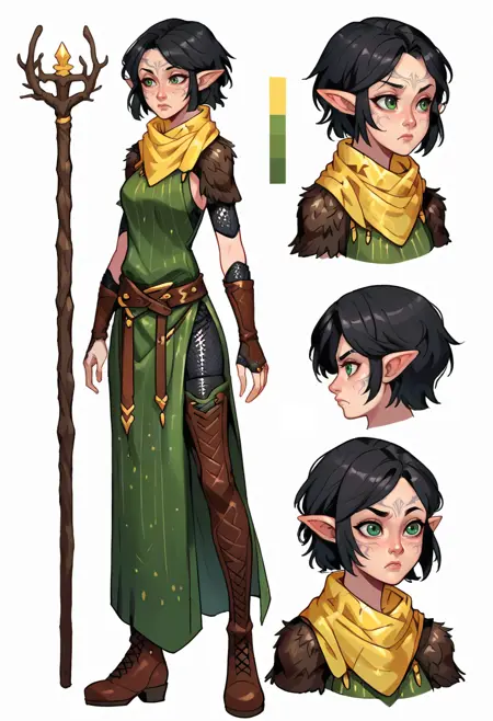 기본 옷차림 - M3rr1LL-ill, 초록 눈, 날카로운 귀, 얼굴 문신, 얼굴 무늬, 짧은 머리, 검은 머리, 체인메일 바지, 체인메일 소매, 녹색 툰릭, 노란 스카프, 털 장식된 어깨 패드, 가죽 팔찌, 허벅지 부츠, 벨트,