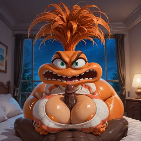 正面提示:AnxietyIO,橙色头发,橙色身体,绿色眼睛,棕色眉毛,大嘴,牙齿,穿着衣服,平坦胸部,条纹衬衫,白色衬衫,橙色衬衫,彩色衬衫,黑色腰带,棕色裤子,棕色靴子