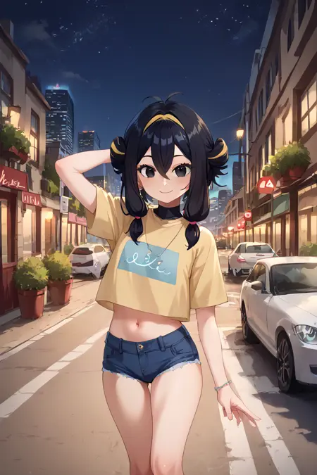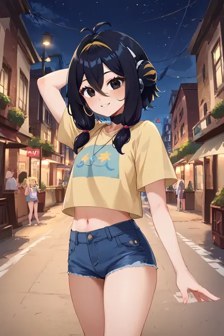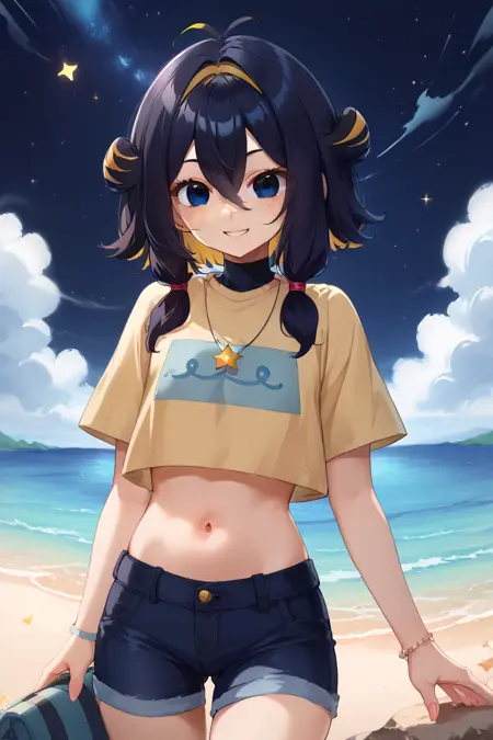 CrayonVT, 1girl, bangs, blonde hair, black hair, hair between eyes, sidelocks, multicolored hair, hairband, black eyes, :3, freckles,