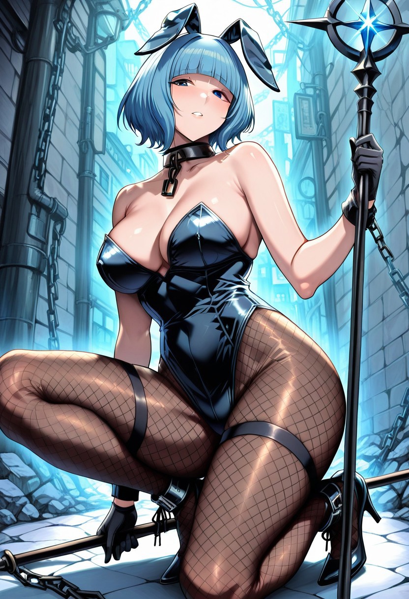 playboy bunny, strapless leotard, cleavage, pantyhose, chain, gloves, collar, high heels, fishnets, bare shoulders,