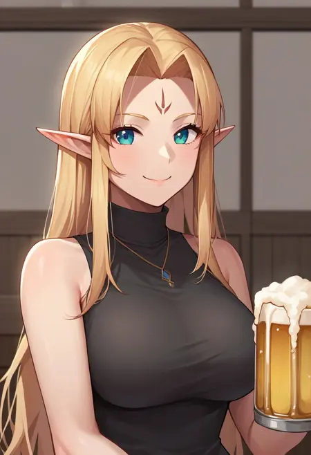 monica_(kichiku_eiyuu), 1girl, solo, long hair, pointy ears, facial mark, forehead mark, bangs, large breasts, elf,