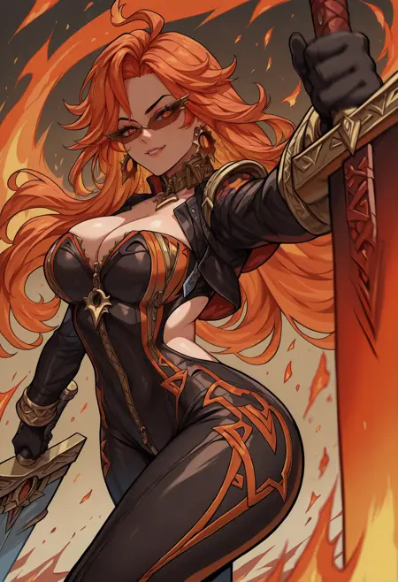 mavkdef, symbol-shaped pupils, red eyes, large breasts, red hair, long hair, ahoge, jewelry, earrings, choker, zipper, bodysuit, clothing cutout, cleavage, black gloves, long sleeves