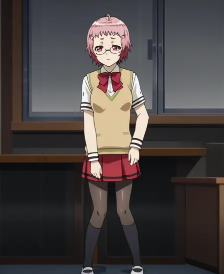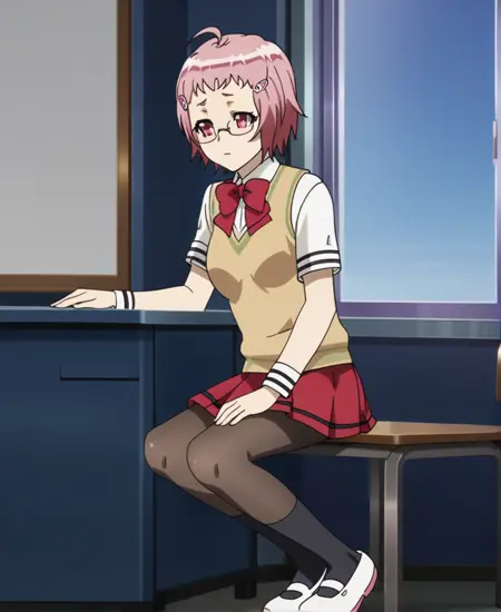 | 训练词汇 | oosawa hami, 1girl, glasses, solo, pink hair, short hair, hair ornament, hairclip, pink eyes, ahoge,已复制! school uniform, skirt, bow, sweater vest, pleated skirt, red skirt, socks, kneehighs, sweater vest, shoes, uwabaki, pantyhose, blazer, black pantyhose, jacket已复制! |