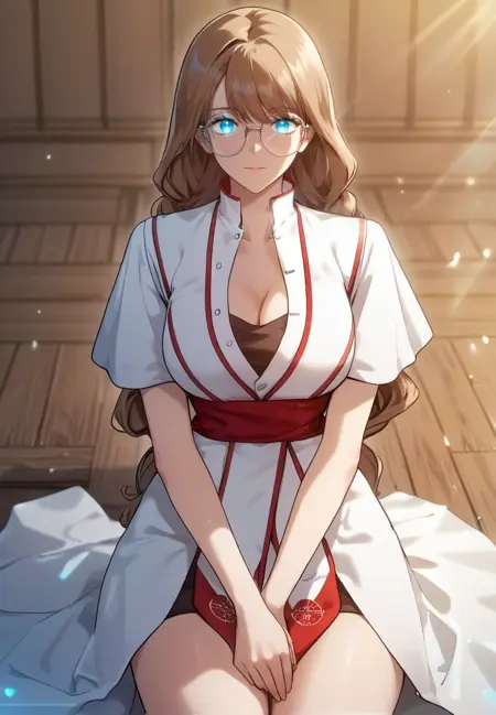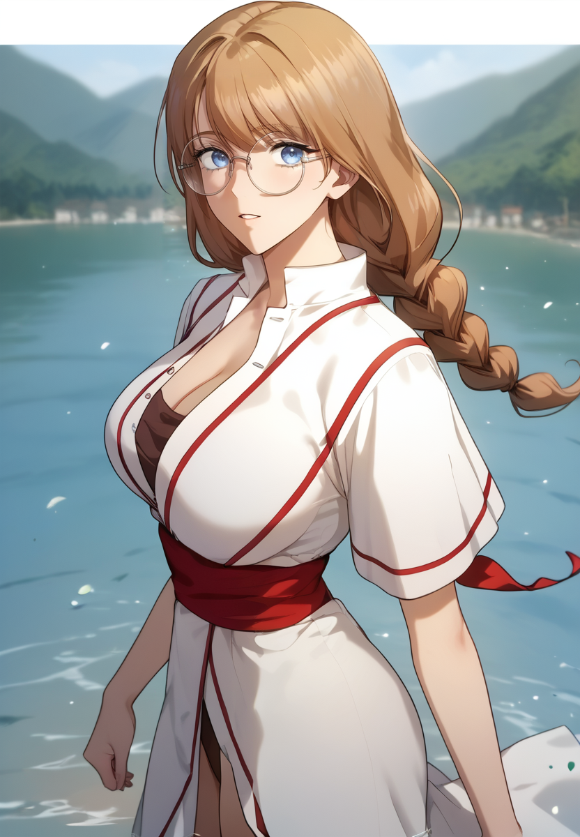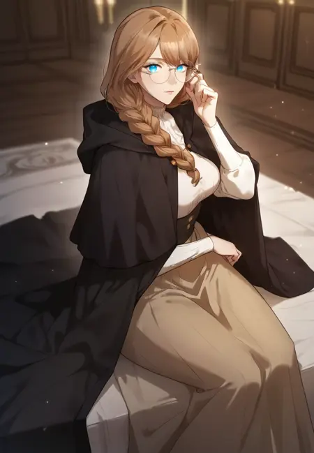 提示词:ethella_im, 1girl, 长发, 辫子, 棕发, 双辫, 紫色眼睛, 发光的蓝色眼睛, 长袍, 和服