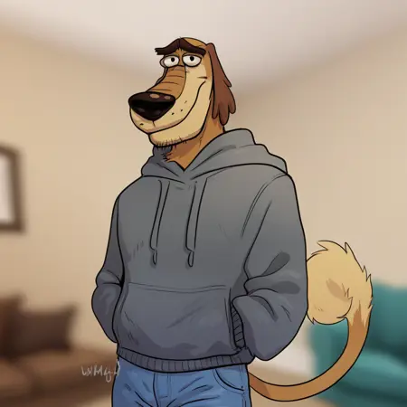 Dukey, broad shoulders, mature male, black eyes, athletic build, animal ears, canine, stubble, anthro, anthro male, tan body, bottom heavy, floppy ears, long snout, light tan underbelly