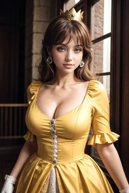 ポジティブプロンプト: LORA, realistic, masterpiece, detailed, 8k, beautiful photography of princess Daisy, yellow long dress, puffed sleeves, white arm glove, orange skirt, brown eyes, golden crown, long hair, brown hair, bangs, long eyelashes, soft makeup, upper body shot, happy,...