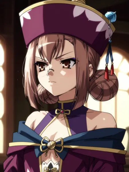 china dress, military uniform, fingerless glovespurple dress, cleavage cutout, bare shoulders, detached sleeves, hatkimono, sash