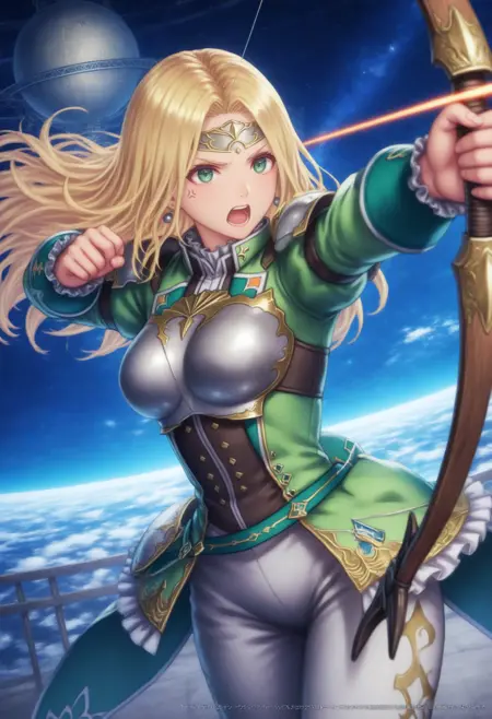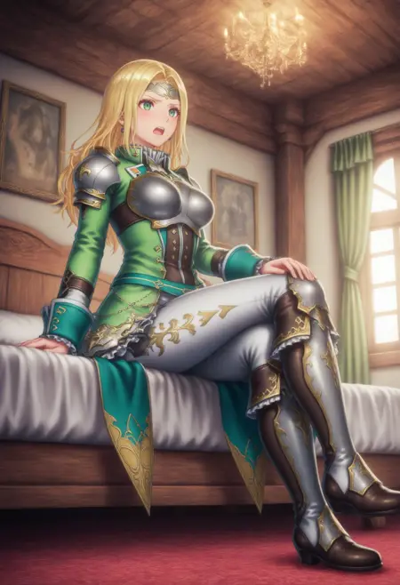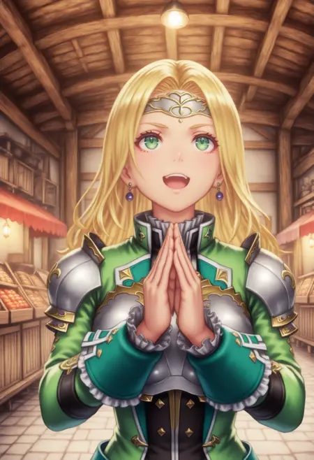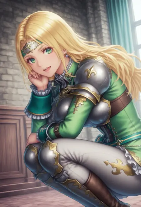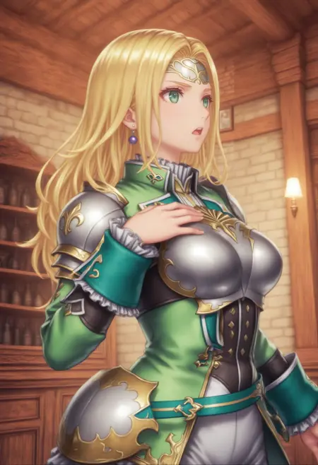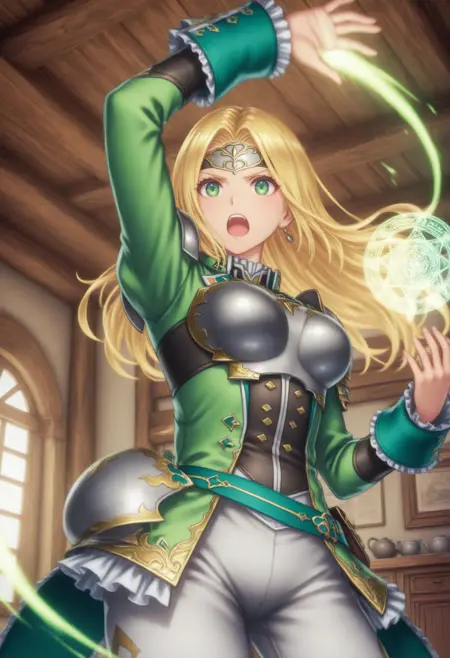 仅使用触发词即可较好地还原角色,但在创建莱扎时,请根据喜好添加以下特征:金发、珠宝、耳环、绿眼、长发、胸甲、肩甲、荷叶边袖子、额饰、紧身胸衣等。若要生成其他角色如杰莉卡或夏莉的不同颜色或装饰变体,请指定相应的颜色。