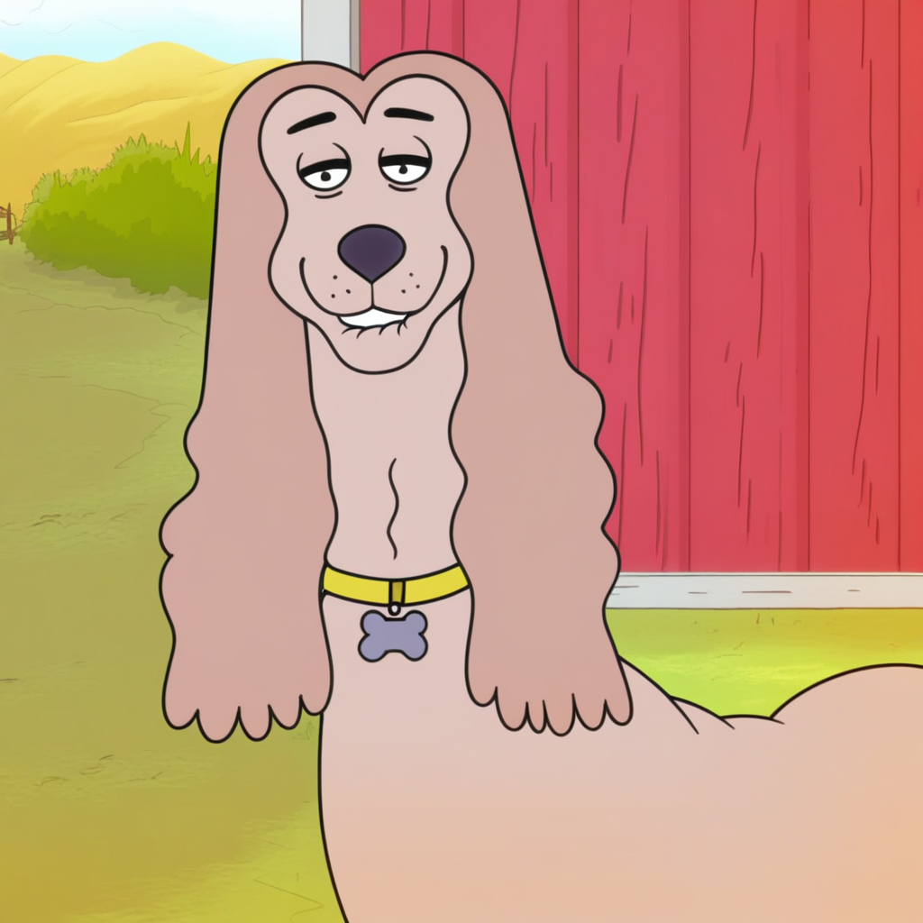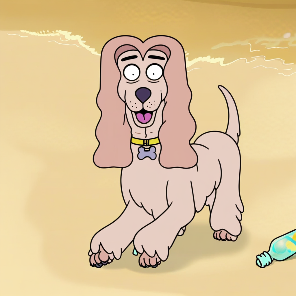 프롬프트: 빅 쿠키, 야생, 혼자, 검은 눈, 노란 목줄, 뼈 모양의 강아지 이름표, 입에 분홍색 공, 수평선, 모래, 구름 자동차, 구름 핸들