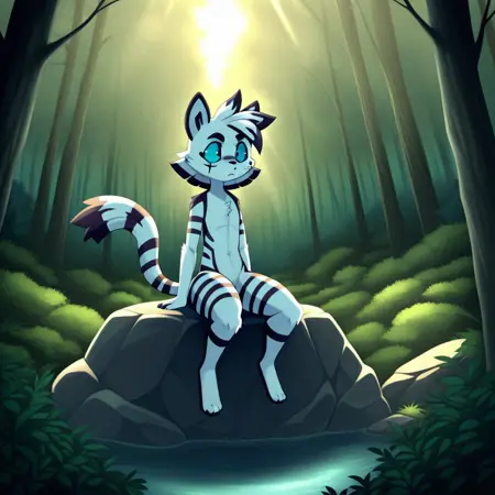 tiger, male furry, semi-anthro, shortstack, white and black fur, striped fur, striped tail, short hair, black eyes, blue sclera, animal ears, scar under eye,