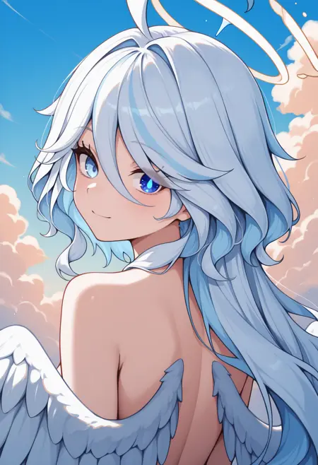 フォカロス: f0calors, 長髪, 多色髪, 水色髪, 白髪, ツンツン髪, アホ毛, 目の間の髪, 側髪, 異色瞳, 青い目, 不一致の瞳孔, 水滴形の瞳孔, ツートーンドレス, グラデーションドレス, 青いドレス, 白いドレス, ジュリエット袖, ネイルポリッシュ, 青いネイル