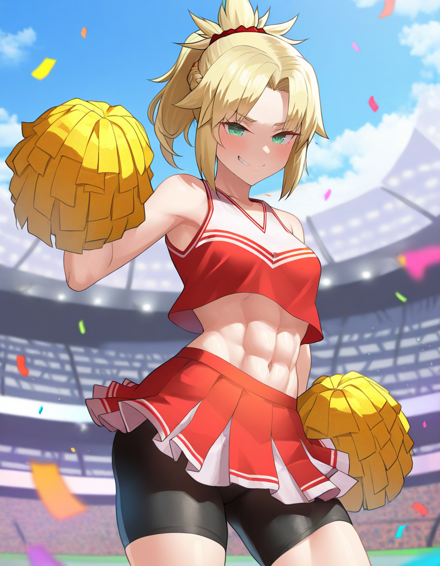 1girl, 금발, 긴 머리, umacheer, 노란 셔츠, 노란 치마, 유혹적인 미소, 퍼프 퍼프 \(응원용\), 응원단, 복부, 배꼽, 노란 눈, 시청자 바라봄