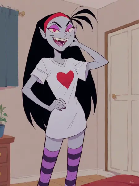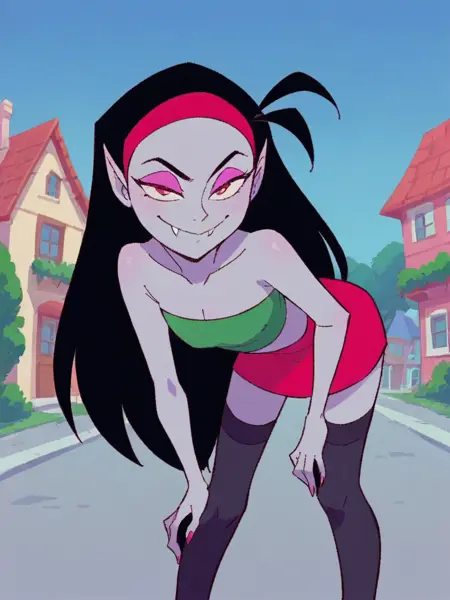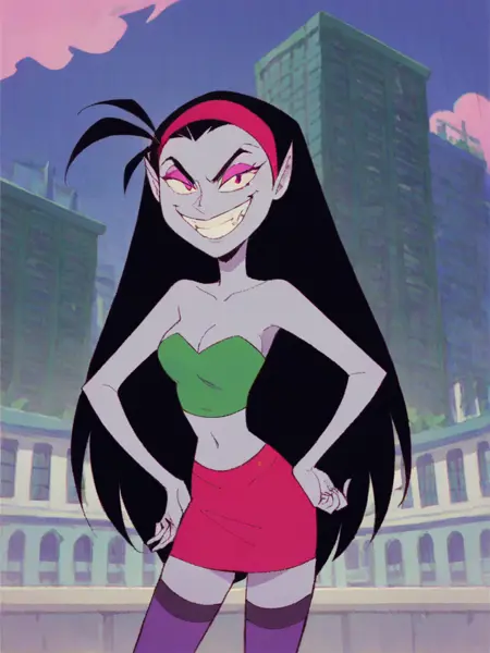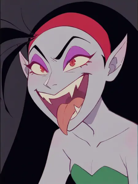 • ファンゴラ・ドラキュラ、黒髪、長い髪、ヘアバンド、灰色の肌、尖った耳、牙、アイシャドウ、