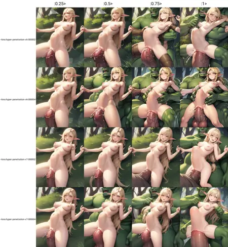 大きな挿入(特に腹部の著しい拡張)を重点的に扱った多数の画像データセットでトレーニングされたLoRAです。多様性と視覚的な干渉の最小化を意識して設計しました。高エポック数・高ウェイトは非常に奇妙な結果になるので、推奨はエポック4、ウェイト0.8以下(v7はそれ以上でも問題ないようです)。それでも極端なコンテンツ向けに設計されています。普通の大きな挿入が求めるのであれば、既に多くのモデルが十分に対応可能です。