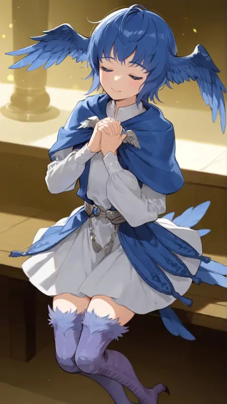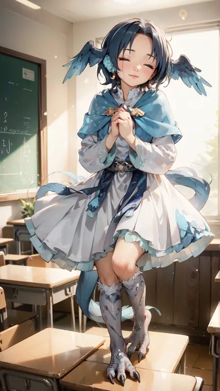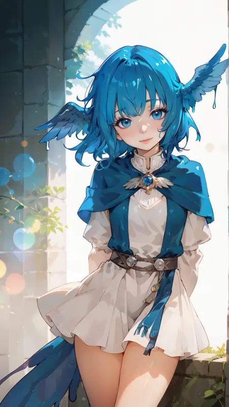 示例提示:"meteion, an anime girl, 1girl, solo, smile, short hair, long sleeves, white background, dress, jewelry, blue hair, standing, tail, full body, closed eyes, flower, outdoors, wings, white dress, tree, capelet, grass, outstretched arms, white flower, monster girl, head wings, brooch, tassel, feathered wings, spread arms, collared dress, bird wings, bird tail, blue capelet, talons, bird girl, bird legs"