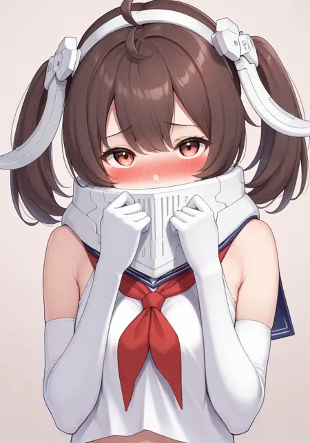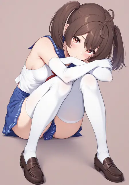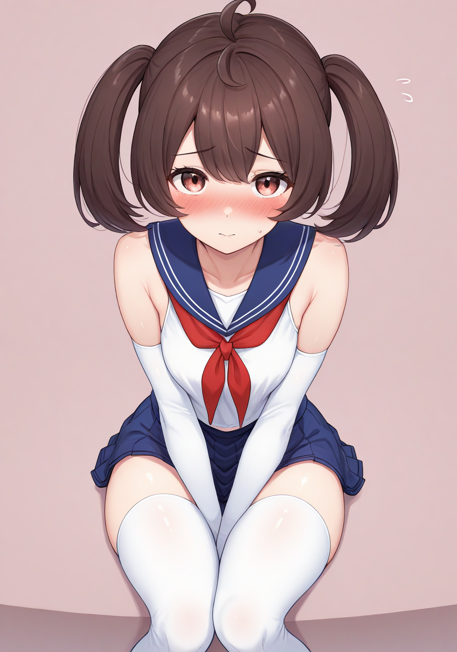 brown hair, twintails, ahoge, serafuku, bare shoulders, white elbow gloves, thighhighs