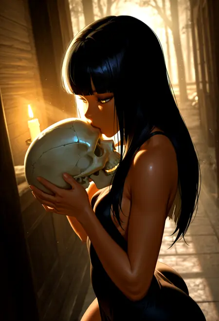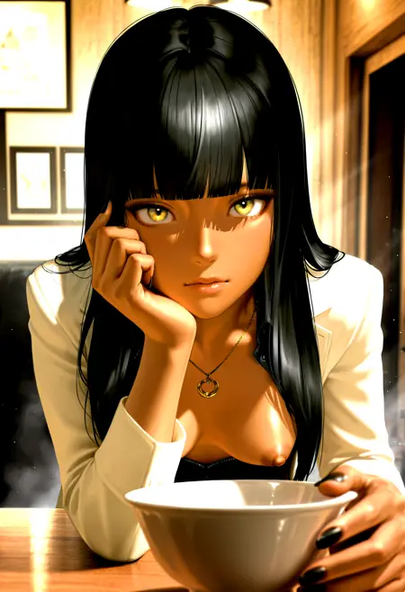 mm_nefari, 1girl, 검은 피부 여성, 노란 눈, 검은 머리, 긴 머리, 곧은 앞머리, 히메컷, 작은 가슴,