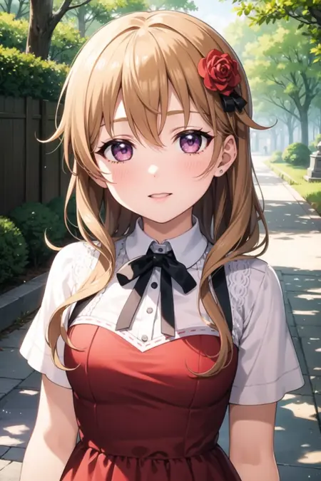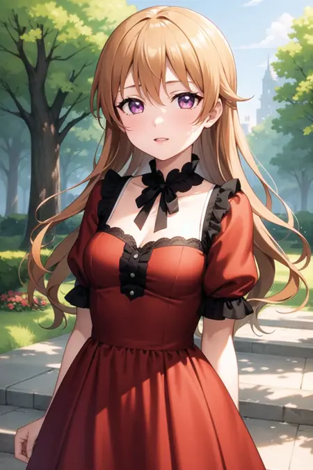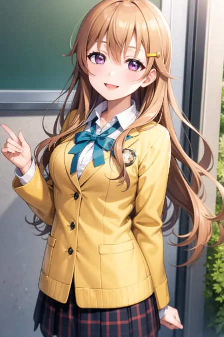 必要タグ: 1girl, solo, konoe kanata, オレンジ色の髪, 紫の目