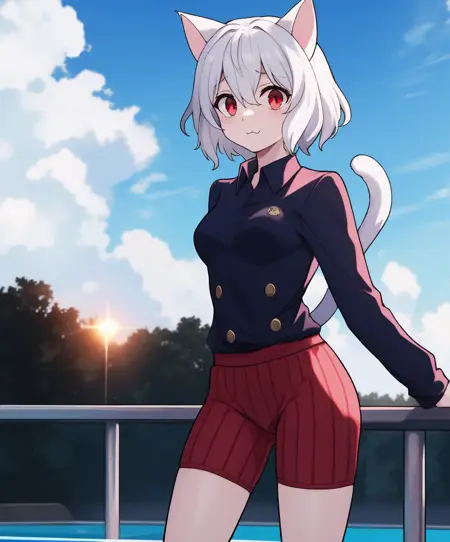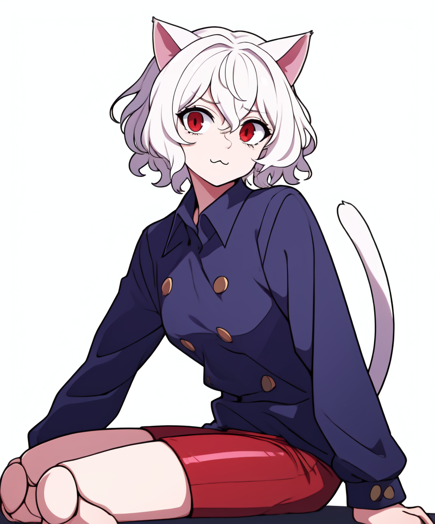 권장 프롬프트: neferpitou_hunterxhunter, 1other, solo, 빨간 눈, 흰색 머리, 꼬리, 양말, 동물 귀, 곱슬머리, 눈 사이 머리카락, 중성적, 단발, 고양이 귀, 관절, 인형 관절, 파란 셔츠, (((고양이 꼬리))), 긴 소매, 반바지, ((벗은 다리)), 빨간 라이트 양말, 빨간 라이트 반바지, (좁은 눈), ((슬림)), 긴 다리, 단추, :3, 줄무늬, (((줄무늬 반바지)))