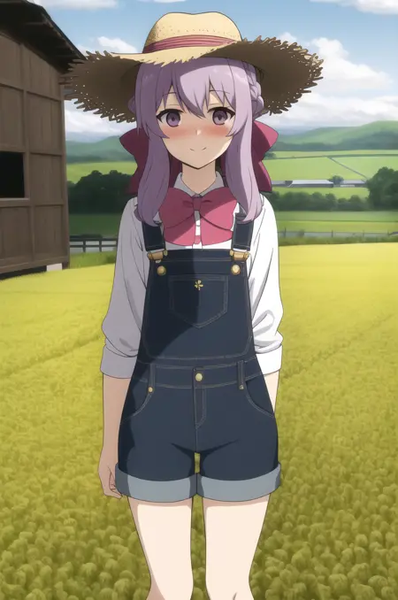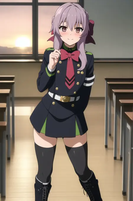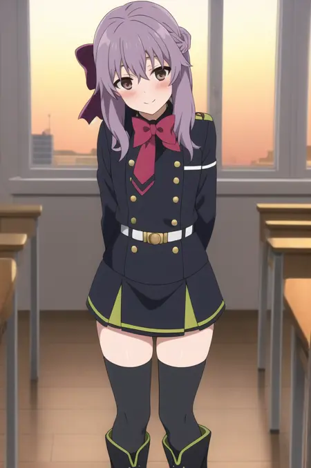 <lora:OwariNoSeraphHiragi-v1-01:0.7>, ChopioHiragi, ボウ、パープルの髪、編み込み、髪飾り、赤いリボン、(blush:1.2)、観覧者を見つめる、1girl、シングル、