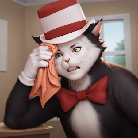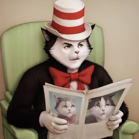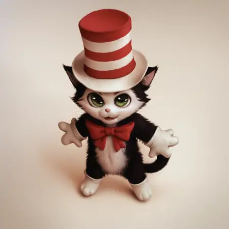 提示词: Cat_in_the_Hat,黑色皮毛,白色面部,红白条纹帽子,红色领结,耳朵,绿色眼睛,白色手套。