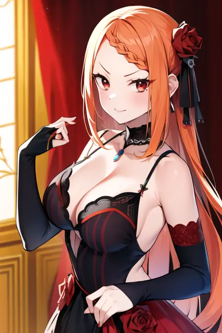 어떤 이유에서인지 가끔 의상이 잘못 표현될 수 있으므로, 아래 태그를 추천합니다: 검은 색 브라이드 장갑, 빨간색 하이힐, 검은 목줄, 귀걸이, 목걸이
