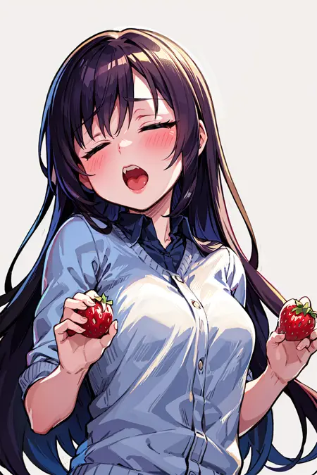 extag: 闭眼,张嘴,食物,手持,水果,草莓,手持食物,上半身,