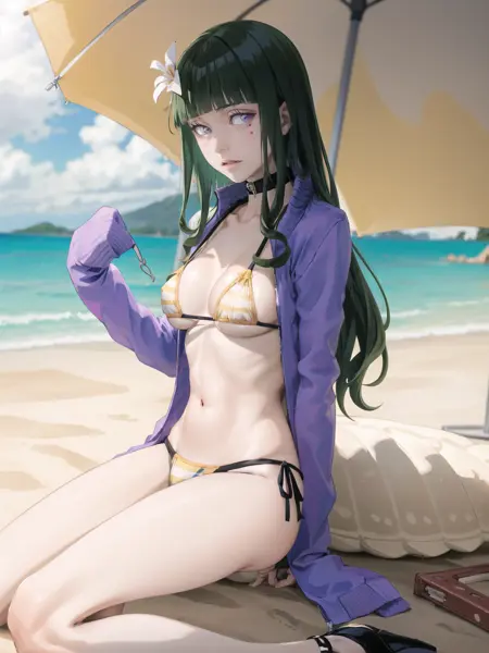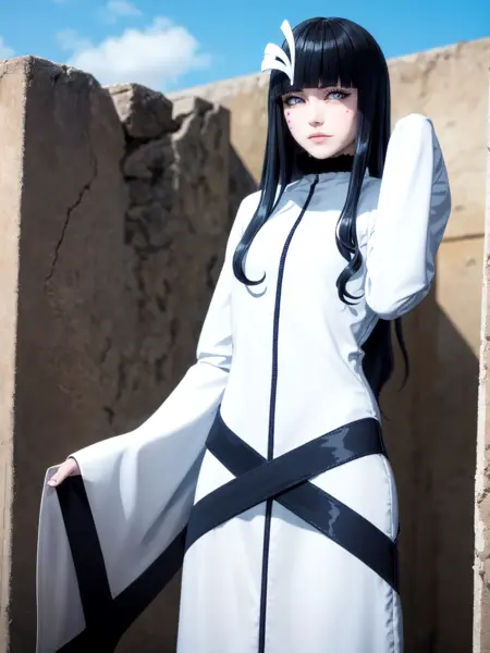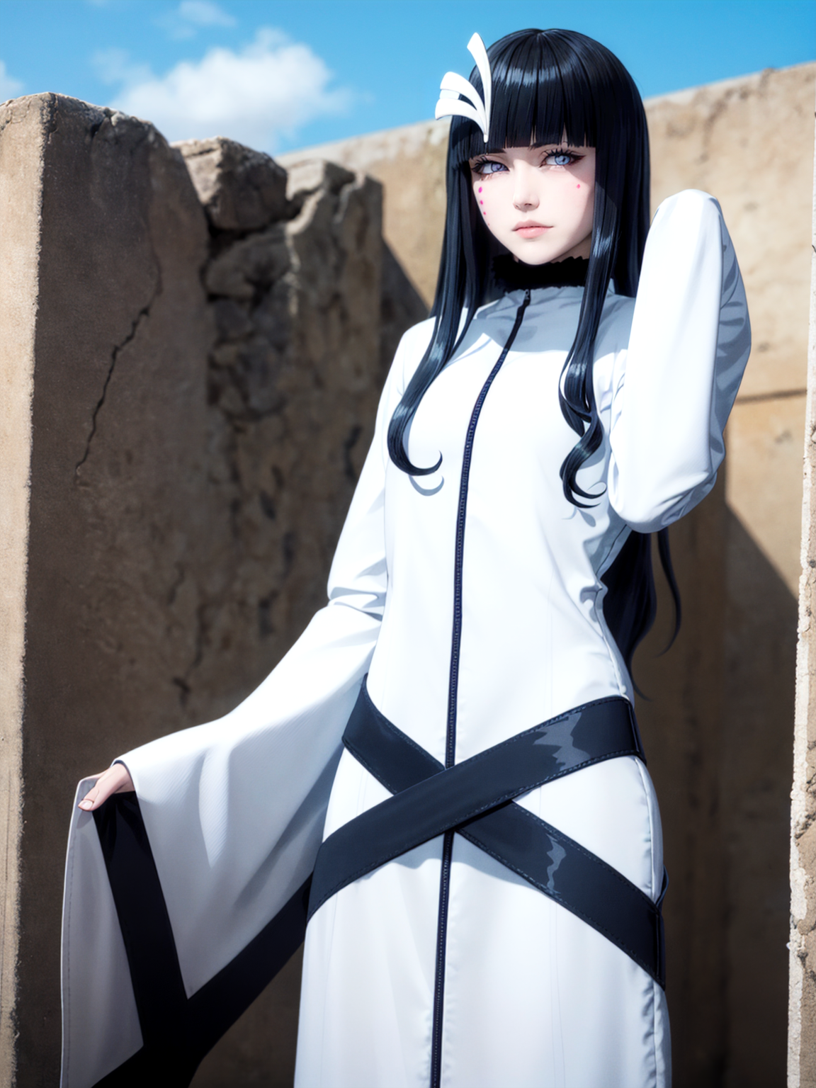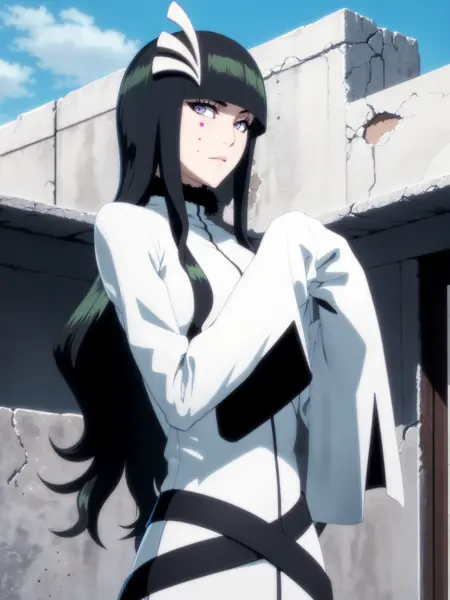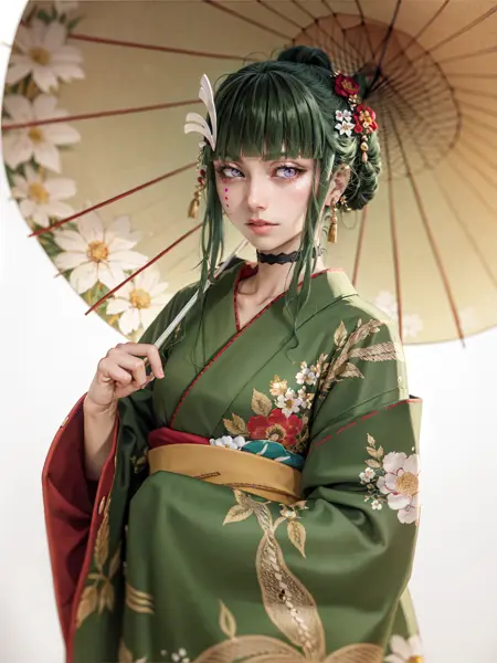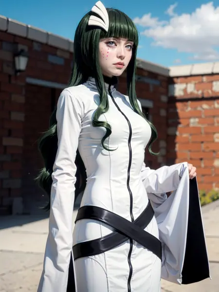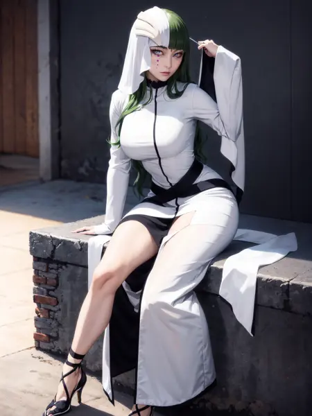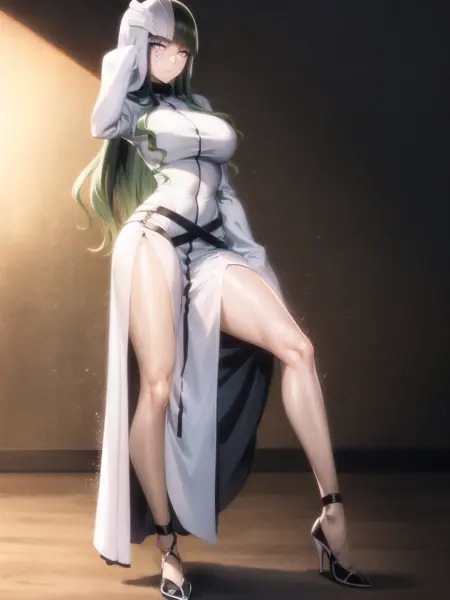 Recommended Tags: cyan sung-sun, blood war outfit, long green/black hair, three pink dots below her right eye, purple eyes, fabric over the right side of her head, fabric over the right side of her shoulder, three hair clip with pendant on the right side her bangs, fur around neck, long white dress with long slit, high-heeled shoes, black fur arounf hem of her dress , legs, two criss-crossing belts, long sleeves,