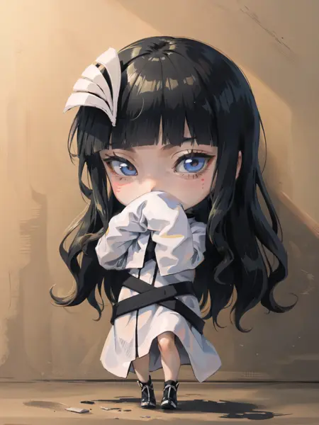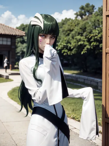 Recommended Tags: cyan sung-sun, standard outfit, long black/green hair, long white dress with long sleeves, three hair clip on the right side her bangs, three pink dots below her right eye, purple eyes, fur around neck, two criss-crossing belts, black shoes, covering mouth,