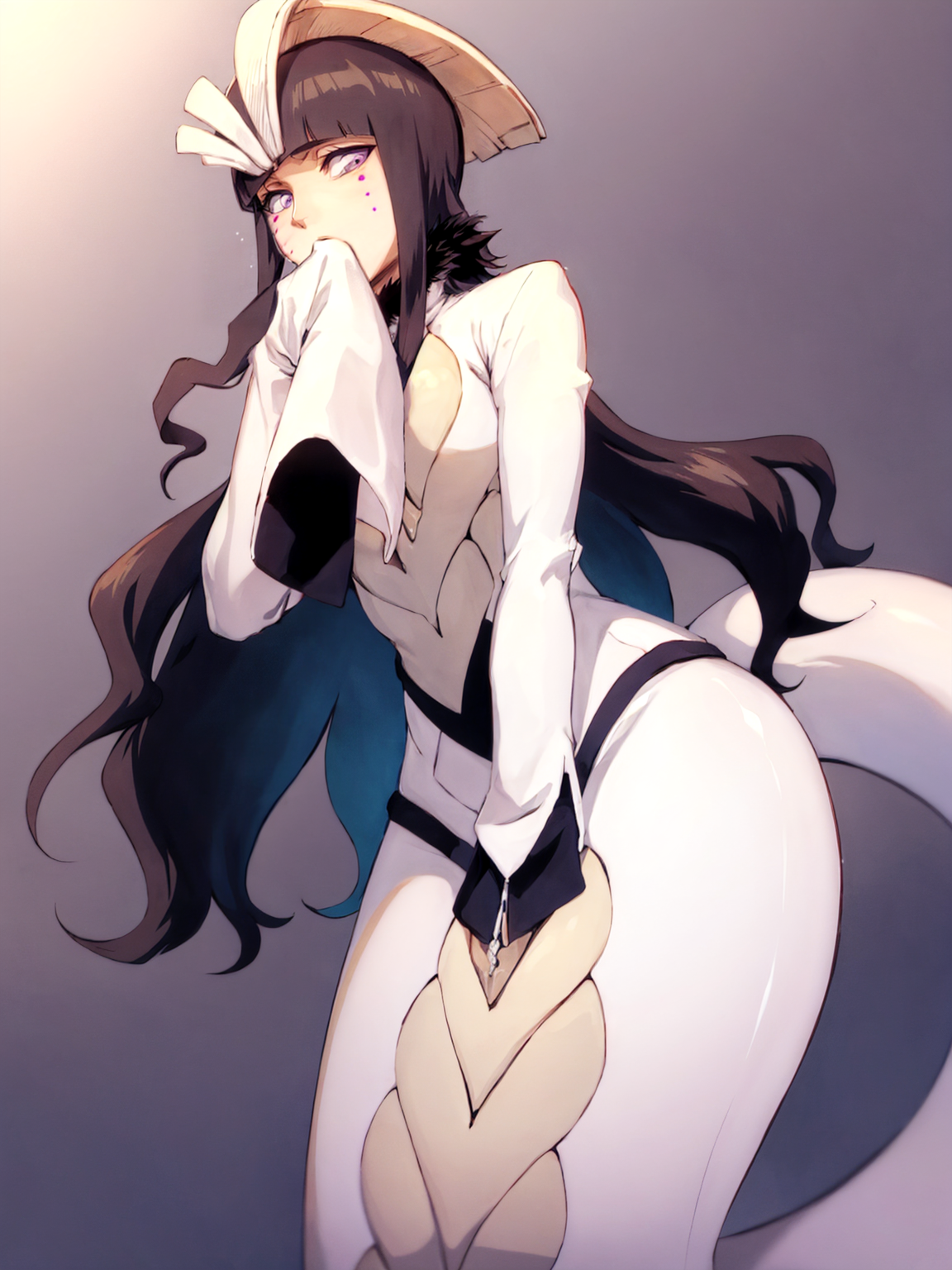 Recommended Tags: cyan sung-sun, resurreccion, lamia, long black/green hair, three pink dots below her right eye, three pink dots below her left eye, purple eyes, feather-like fur around neck, armor plating on the right side her head, monster girl, long sleeves, white tail, underbelly scales