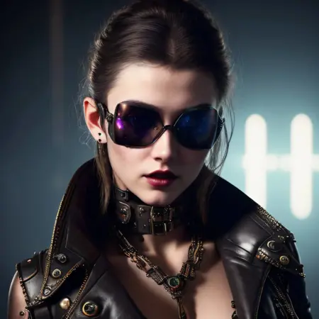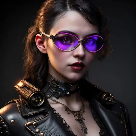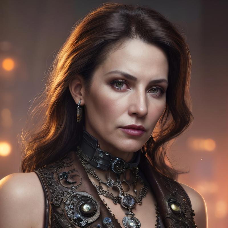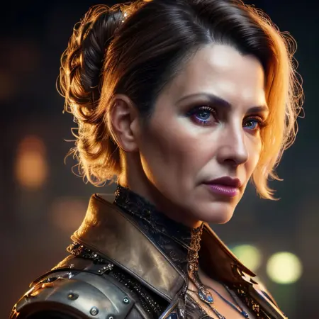 masterpiece, close-up photo, intricate photo of a beautiful middle aged female model,  steampunk,  cyberpunk art ,  neon colors, photo realistic, highly detailed, sharp focus, front view, front light, studio lighting, 8K, MyMaleConcept:0.5