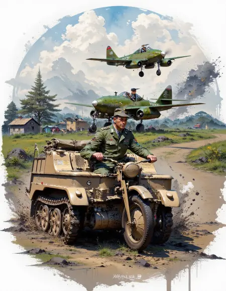 如果你不输入触发词“kettenkrad”就直接点击生成,它会像示例图片那样牵引人、Ta183、Me262、货物、狗(狗?为什么?)、