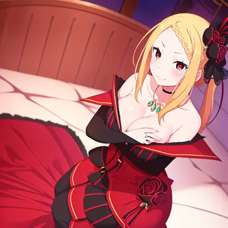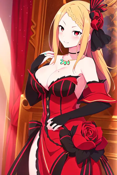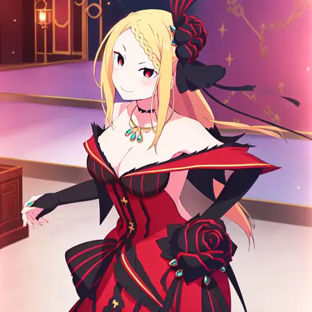 for some reason it can mess up her clothes sometimes, so I suggest using these tags: black bridal_gauntlets, red_high_heels, black choker, earings, necklace.