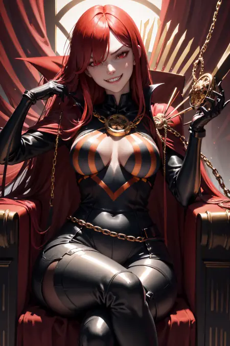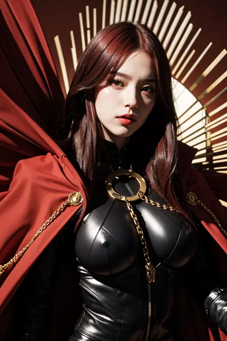 • Demon King Nobunaga: large breasts,red eyes,red hair,black bodysuit,chain,collared cape