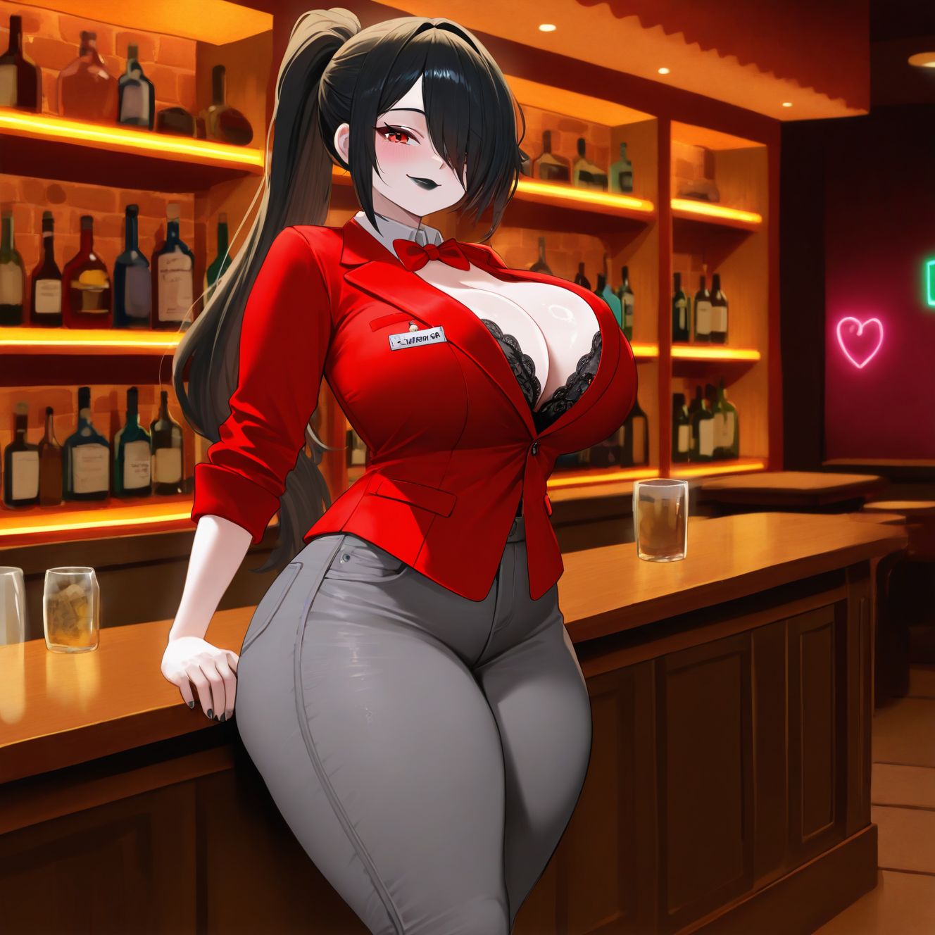 | 训练词汇 | white skin, black hair, long hair, hair over one eye, red eyes, black lips,已复制! black shirt, skull print, grey pants, jeans, ripped jeans, red shoes,已复制! bartendress, red bra, name badge, red suit, red shirt, red bowtie, bowtie, grey pants, jeans, cleavage,已复制! |