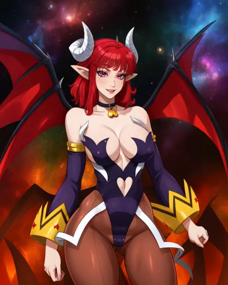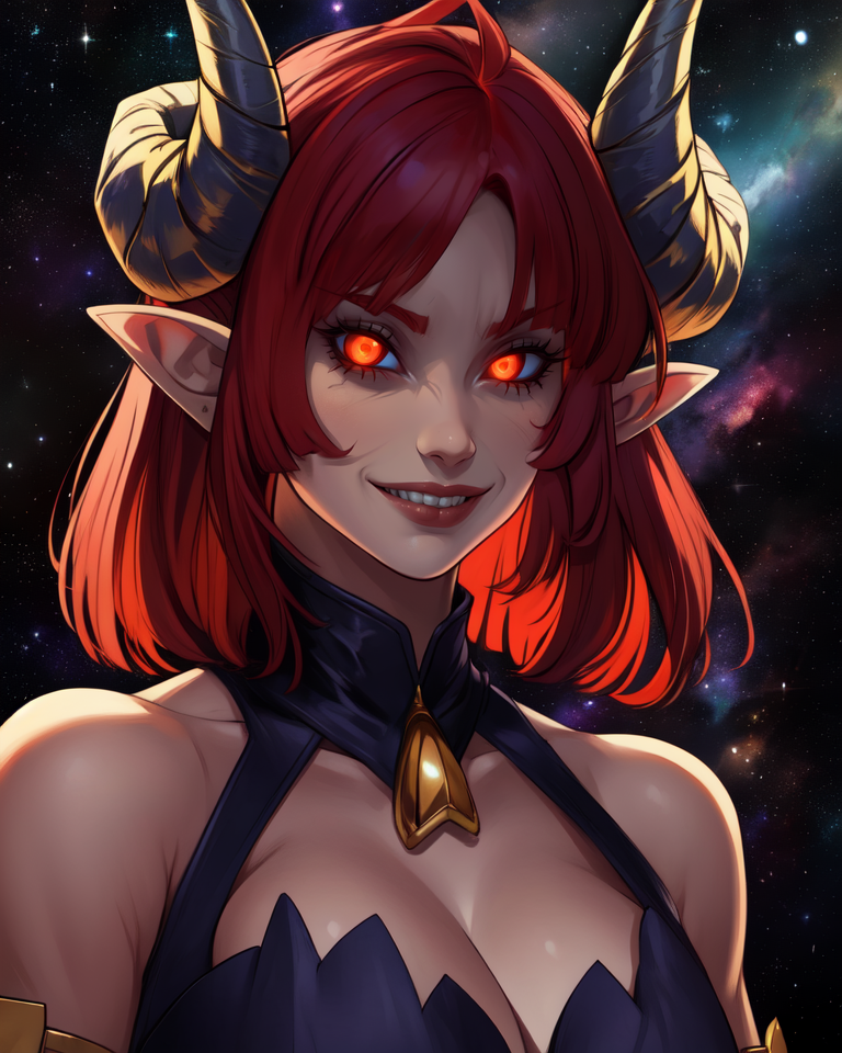 Priere, 尖った耳、角、赤い髪、赤い目、