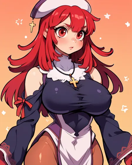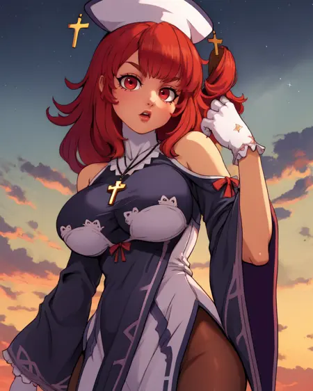 帽子,白色连衣裙或裙子,丝袜,手套,十字架,项链,宽袖,长袖,鞋子